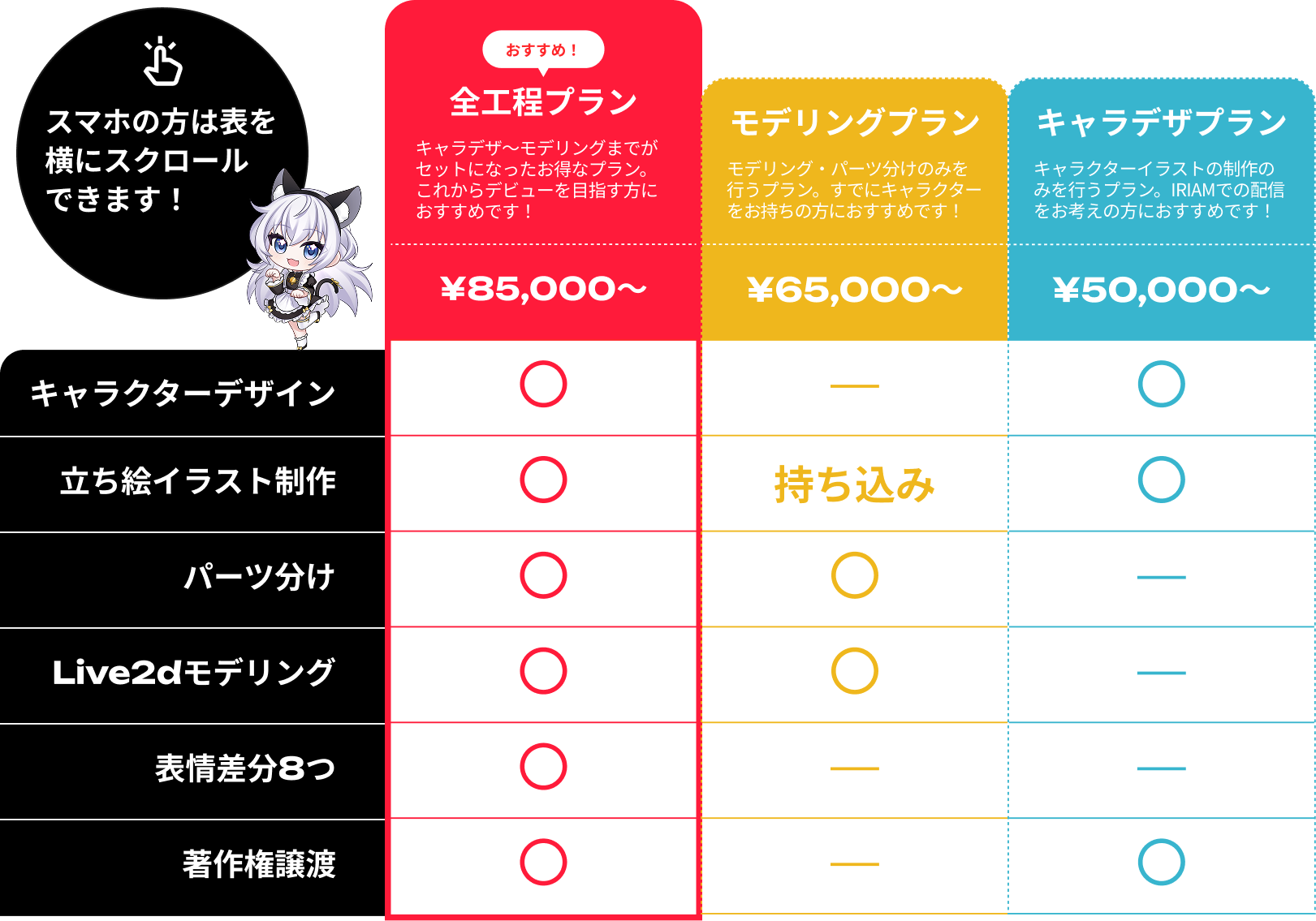 ラフ画段階での修正は無制限でございます!ラフ画完成後にキャラクターの仕様が大きく変わるような修正(衣装や髪型など)が発生する場合は、追加の修正費用を頂戴する可能性がございます。